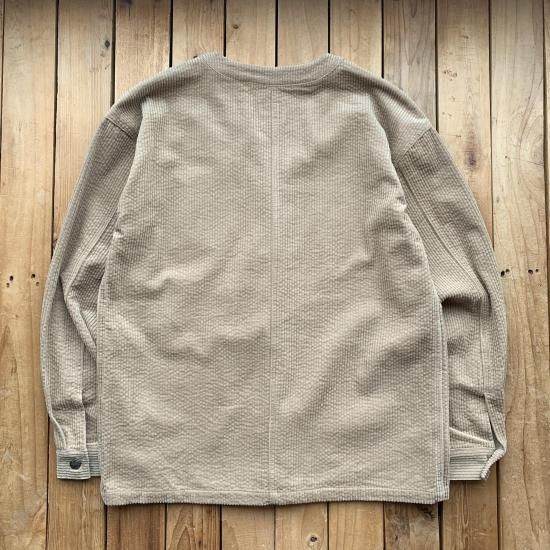 ポケットワークは左胸と両サイドにすることで日常で手を差し込む自然な動作の中に、ワークウェアらしい機能性を感じられるデザインです。刻印入りのメタルボタンがさりげないアクセント。軽い羽織としてカーディガン感覚で、あるいはスウェットの上にアウターとして。シーンを選ばず、日々のスタイルに自然と溶け込む一着です。