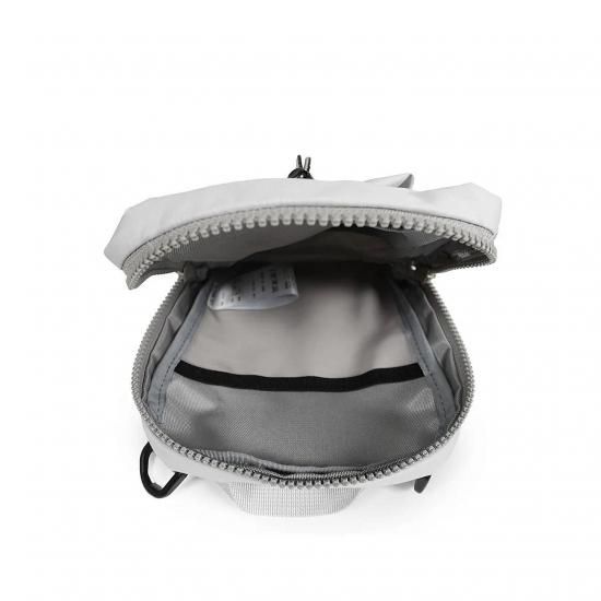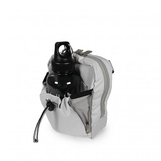 前面にはコード巾着式のボトルポケットを配しており、ポケット両サイドがファスナーで拡張できるようになっているため、ボトルサイズに合わせて調整いただけます。
