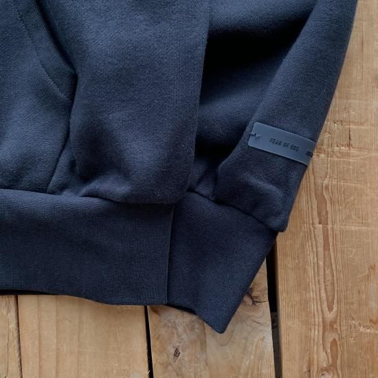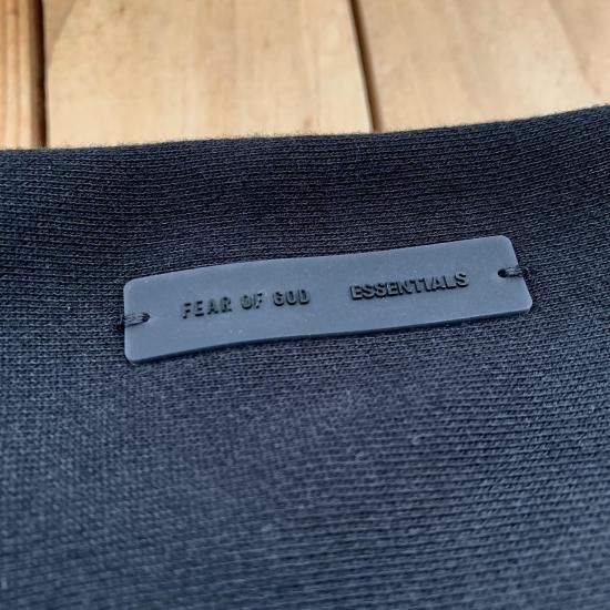 背中には大きく "ESSENTIALS FEAR OF GOD" の文字がフロッキープリントされてあります。左袖とフードにはラバーパッチがついています。
