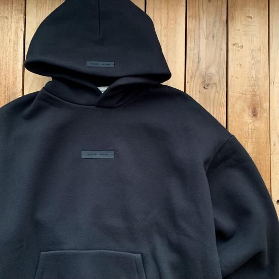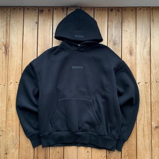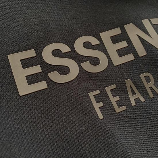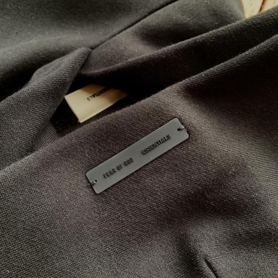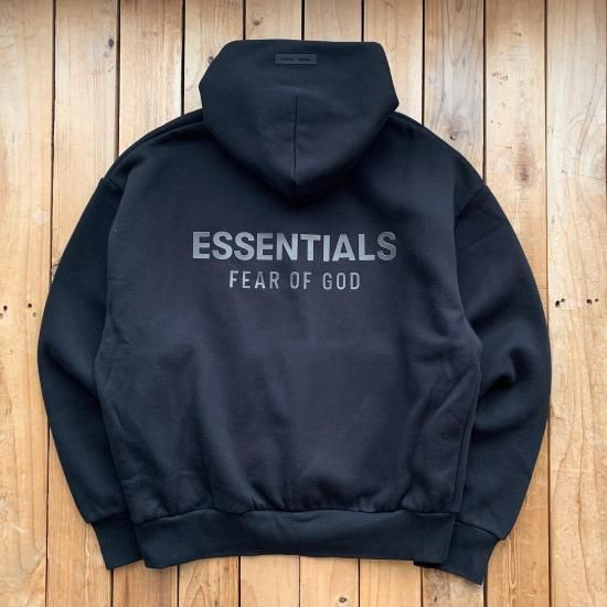 背中には大きく "ESSENTIALS FEAR OF GOD" の文字がフロッキープリントされてあります。フロントとフードにはラバーパッチがついています。